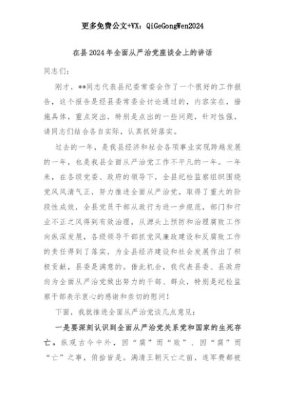 【七哥公文】2025年:在县2024年全面从严治党座谈会上的讲话+更多免费公文+VX:QiGeGongWen2024+更多免费公文+VX:QiGeGongWen2024