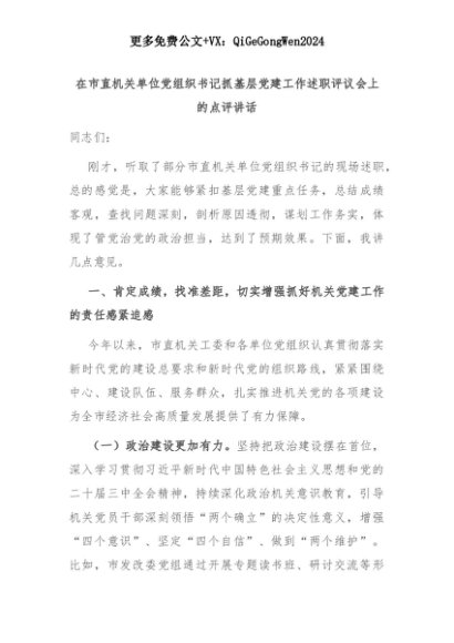 【七哥公文】2025年:在市直机关单位党组织书记抓基层党建工作述职评议会上的点评讲话+更多免费公文+VX:QiGeGongWen2024+更多免费公文+VX:QiGeGongWen2024