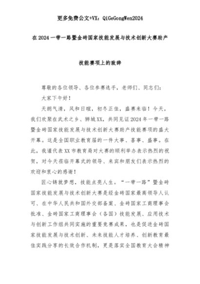 【七哥公文】2025年:在2024一带一路暨金砖国家技能发展与技术创新大赛助产技能赛项上的致辞+更多免费公文+VX:QiGeGongWen2024+更多免费公文+VX:QiGeGongWen2024