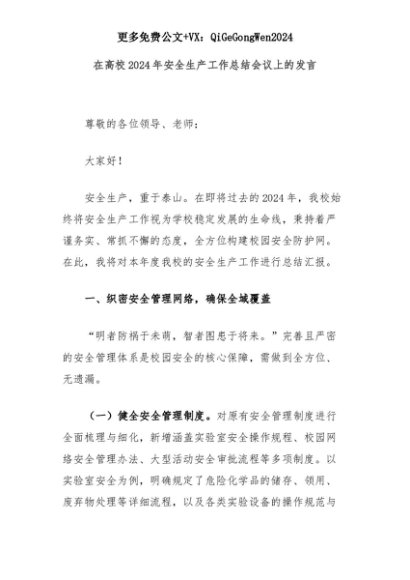 【七哥公文】2025年:在高校2024年安全生产工作总结会议上的发言+更多免费公文+VX:QiGeGongWen2024+更多免费公文+VX:QiGeGongWen2024
