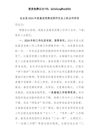 【七哥公文】2025年:在全县2024年度基层党建述职评议会上的点评讲话+更多免费公文+VX:QiGeGongWen2024+更多免费公文+VX:QiGeGongWen2024