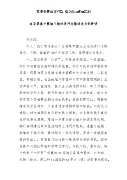 【七哥公文】2025年:在全县集中整治土地违法行为推进会上的讲话+更多免费公文+VX:QiGeGongWen2024+更多免费公文+VX:QiGeGongWen2024
