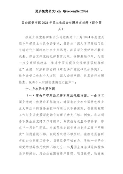 【七哥公文】2025年:国企纪委书记2024年民主生活会对照发言材料(四个带头)+更多免费公文+VX:QiGeGongWen2024+更多免费公文+VX:QiGeGongWen2024