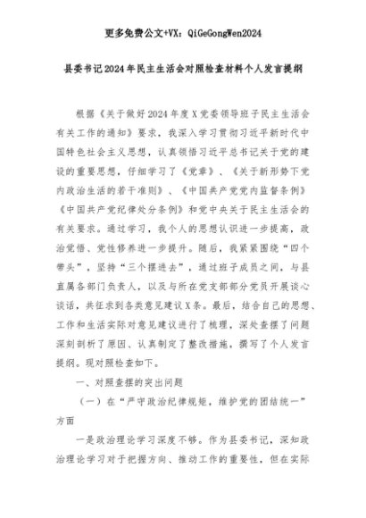 【七哥公文】2025年:县委书记2024年民主生活会对照检查材料个人发言提纲+更多免费公文+VX:QiGeGongWen2024+更多免费公文+VX:QiGeGongWen2024