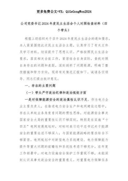 【七哥公文】2025年:公司党委书记2024年度民主生活会个人对照检查材料(四个带头)+更多免费公文+VX:QiGeGongWen2024+更多免费公文+VX:QiGeGongWen2024