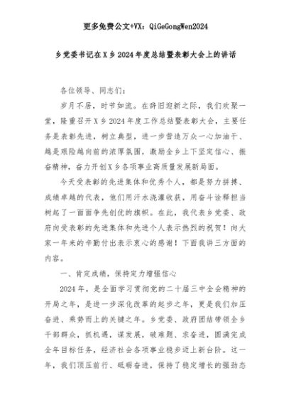 【七哥公文】2025年:乡党委书记在X乡2024年度总结暨表彰大会上的讲话+更多免费公文+VX:QiGeGongWen2024+更多免费公文+VX:QiGeGongWen2024
