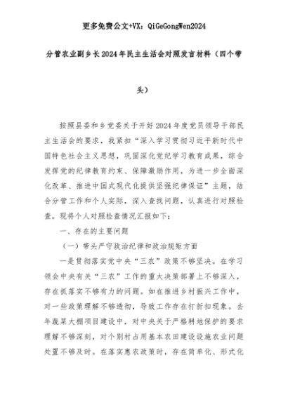 【七哥公文】2025年:分管农业副乡长2024年民主生活会对照发言材料(四个带头)+更多免费公文+VX:QiGeGongWen2024+更多免费公文+VX:QiGeGongWen2024
