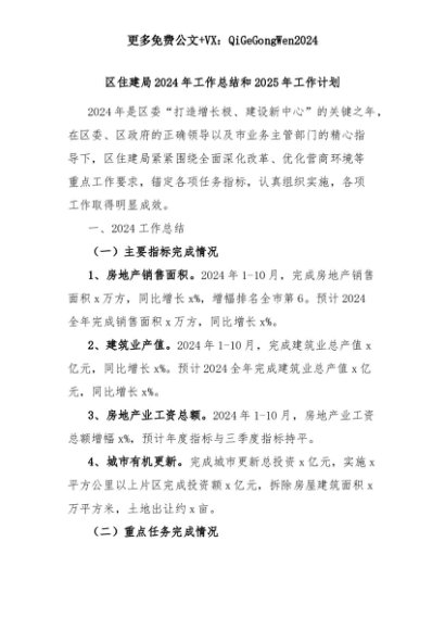 【七哥公文】2025年:区住建局2024年工作总结和2025年工作计划+更多免费公文+VX:QiGeGongWen2024+更多免费公文+VX:QiGeGongWen2024