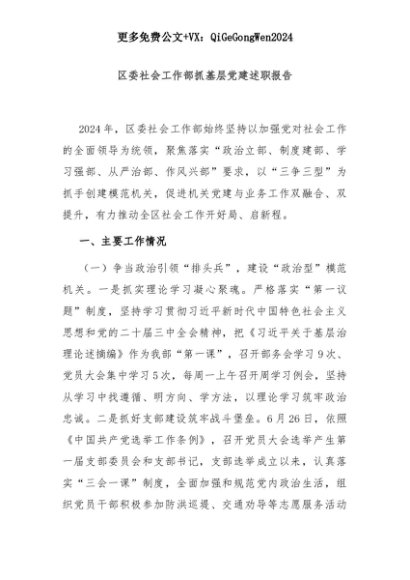 【七哥公文】2025年:区委社会工作部抓基层党建述职报告+更多免费公文+VX:QiGeGongWen2024+更多免费公文+VX:QiGeGongWen2024