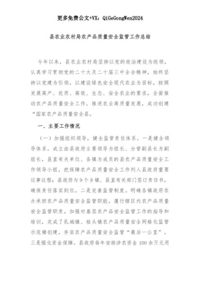 【七哥公文】2025年:县农业农村局农产品质量安全监管工作总结+更多免费公文+VX:QiGeGongWen2024+更多免费公文+VX:QiGeGongWen2024