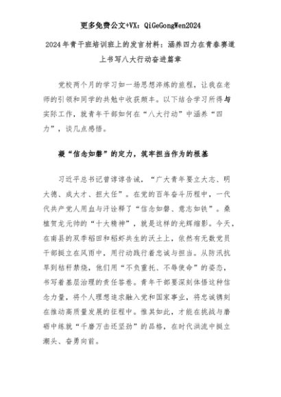 【七哥公文】2025年:2024年青干班培训班上的发言材料:涵养四力在青春赛道上书写八大行动奋进篇章+更多免费公文+VX:QiGeGongWen2024+更多免费公文+VX:QiGeGongWen2024