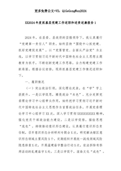 【七哥公文】2025年:XX2024年度抓基层党建工作述职和述责述廉报告1+更多免费公文+VX:QiGeGongWen2024+更多免费公文+VX:QiGeGongWen2024