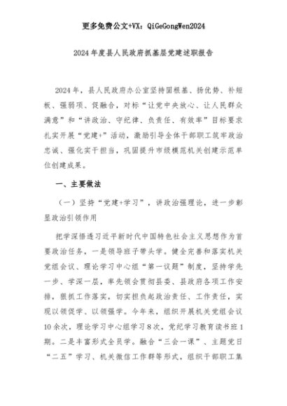 【七哥公文】2025年:2024年度县人民政府抓基层党建述职报告+更多免费公文+VX:QiGeGongWen2024+更多免费公文+VX:QiGeGongWen2024