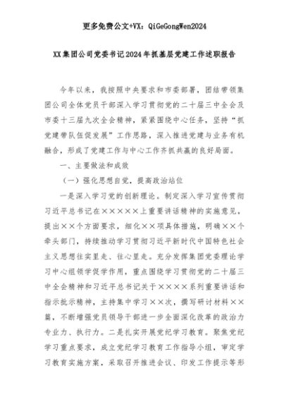 【七哥公文】2025年:XX集团公司党委书记2024年抓基层党建工作述职报告+更多免费公文+VX:QiGeGongWen2024+更多免费公文+VX:QiGeGongWen2024