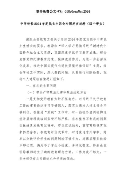 【七哥公文】2025年:中学校长2024年度民主生活会对照发言材料(四个带头)+更多免费公文+VX:QiGeGongWen2024+更多免费公文+VX:QiGeGongWen2024