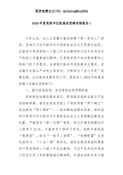 【七哥公文】2025年:2024年度党委书记抓基层党建述职报告1+更多免费公文+VX:QiGeGongWen2024+更多免费公文+VX:QiGeGongWen2024