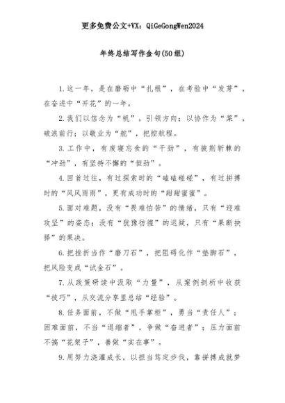 【七哥公文】2025年:(50组)年终总结写作金句+更多免费公文+VX:QiGeGongWen2024+更多免费公文+VX:QiGeGongWen2024