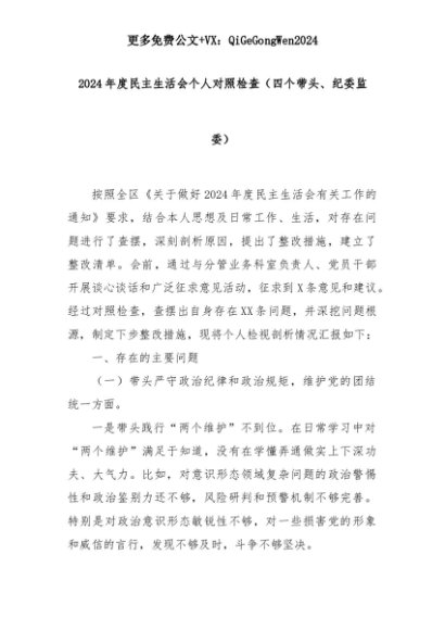 【七哥公文】2025年:2024年度民主生活会个人对照检查(四个带头、纪委监委)+更多免费公文+VX:QiGeGongWen2024+更多免费公文+VX:QiGeGongWen2024