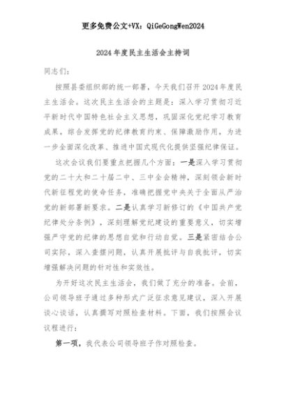 【七哥公文】2025年:2024年度民主生活会主持词+更多免费公文+VX:QiGeGongWen2024+更多免费公文+VX:QiGeGongWen2024