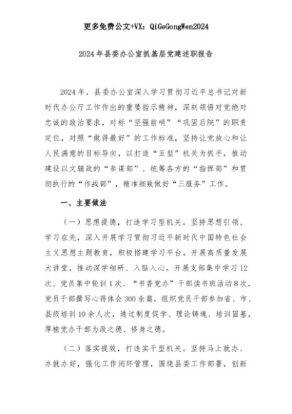 【七哥公文】2025年:2024年县委办公室抓基层党建述职报告+更多免费公文+VX:QiGeGongWen2024+更多免费公文+VX:QiGeGongWen2024