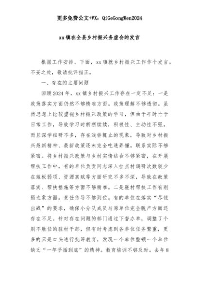 【七哥公文】2025年:xx镇在全县乡村振兴务虚会的发言+更多免费公文+VX:QiGeGongWen2024+更多免费公文+VX:QiGeGongWen2024