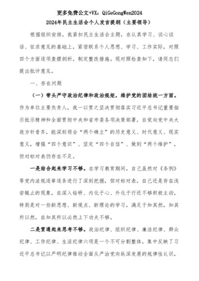 【七哥公文】2025年:(12个不够)主要领导2024年对照检查材料个人发言提纲+更多免费公文+VX:QiGeGongWen2024+更多免费公文+VX:QiGeGongWen2024