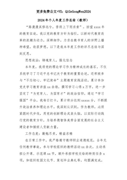 【七哥公文】2025年:2024年个人年度工作总结(教师)+更多免费公文+VX:QiGeGongWen2024+更多免费公文+VX:QiGeGongWen2024