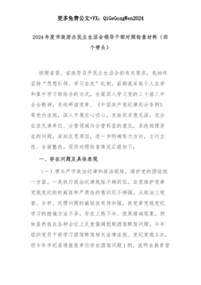 【七哥公文】2025年:2024年度市政府办民主生活会领导干部对照检查材料(四个带头)+更多免费公文+VX:QiGeGongWen2024+更多免费公文+VX:QiGeGongWen2024