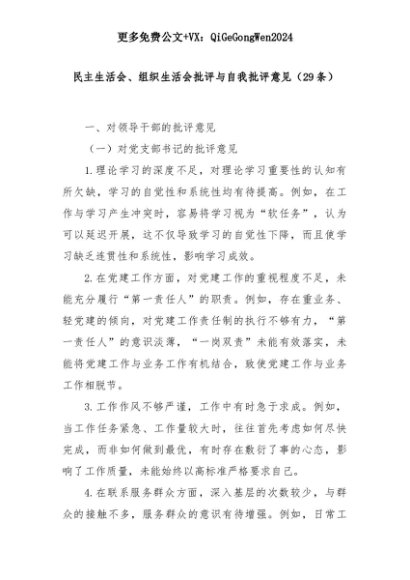 【七哥公文】2025年:(29条)民主生活会、组织生活会批评与自我批评意见+更多免费公文+VX:QiGeGongWen2024+更多免费公文+VX:QiGeGongWen2024