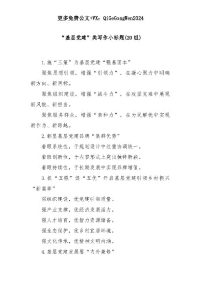 【七哥公文】2025年:(20组)“基层党建”类写作小标题+更多免费公文+VX:QiGeGongWen2024+更多免费公文+VX:QiGeGongWen2024