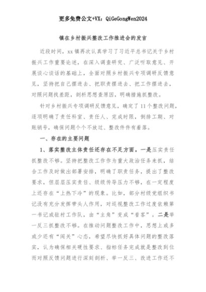 【七哥公文】2025年:镇在乡村振兴整改工作推进会的发言+更多免费公文+VX:QiGeGongWen2024+更多免费公文+VX:QiGeGongWen2024