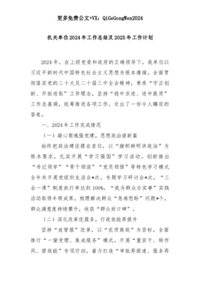 【七哥公文】2025年:机关单位2024年工作总结及2025年工作计划+更多免费公文+VX:QiGeGongWen2024+更多免费公文+VX:QiGeGongWen2024