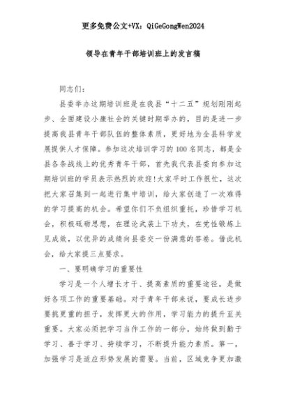 【七哥公文】2025年:领导在青年干部培训班上的发言稿+更多免费公文+VX:QiGeGongWen2024+更多免费公文+VX:QiGeGongWen2024