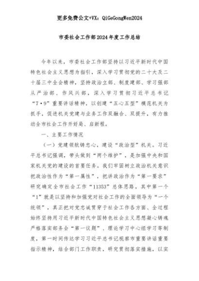 【七哥公文】2025年:市委社会工作部2024年度工作总结+更多免费公文+VX:QiGeGongWen2024+更多免费公文+VX:QiGeGongWen2024