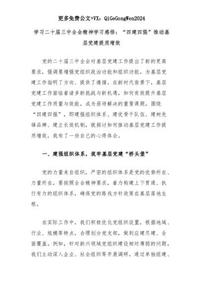 【七哥公文】2025年:学习二十届三中全会精神学习感悟:“四建四强”推动基层党建提质增效+更多免费公文+VX:QiGeGongWen2024+更多免费公文+VX:QiGeGongWen2024
