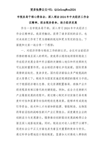 【七哥公文】2025年:市税务局干部心得体会:深入领会2024年中央经济工作会议精神,担当税务使命,助力经济发展+更多免费公文+VX:QiGeGongWen2024+更多免费公文+VX:QiGeGongWen2024