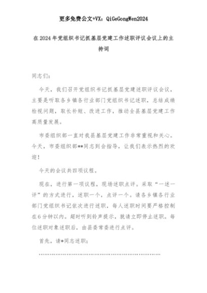 【七哥公文】2025年:在2024年党组织书记抓基层党建工作述职评议会议上的主持词+更多免费公文+VX:QiGeGongWen2024+更多免费公文+VX:QiGeGongWen2024