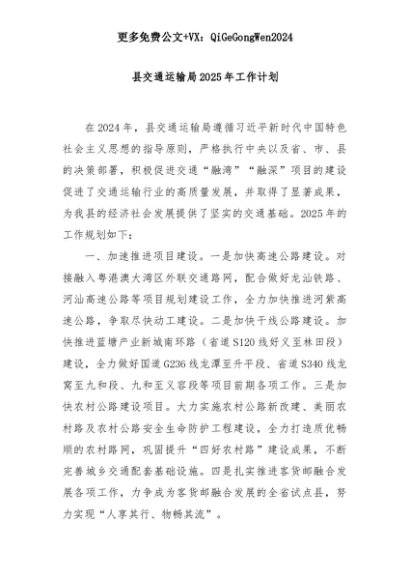 【七哥公文】2025年:县交通运输局2025年工作计划+更多免费公文+VX:QiGeGongWen2024+更多免费公文+VX:QiGeGongWen2024