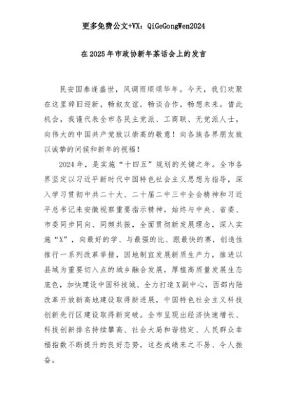 【七哥公文】2025年:在2025年市政协新年茶话会上的发言+更多免费公文+VX:QiGeGongWen2024+更多免费公文+VX:QiGeGongWen2024