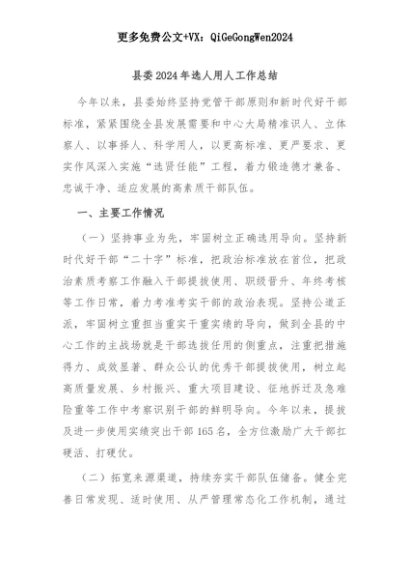 【七哥公文】2025年:县委2024年选人用人工作总结+更多免费公文+VX:QiGeGongWen2024+更多免费公文+VX:QiGeGongWen2024