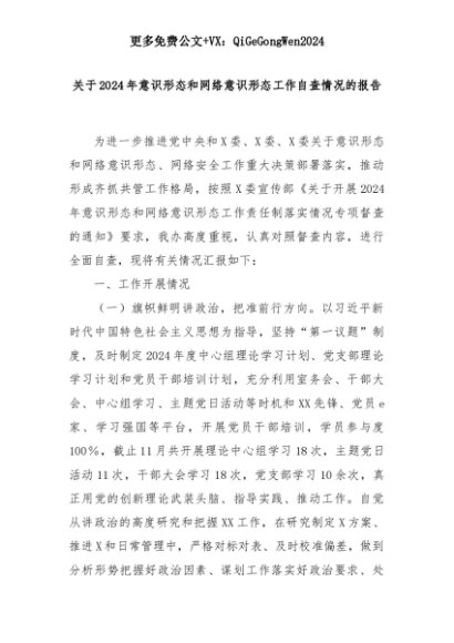 【七哥公文】2025年:关于2024年意识形态和网络意识形态工作自查情况的报告+更多免费公文+VX:QiGeGongWen2024+更多免费公文+VX:QiGeGongWen2024