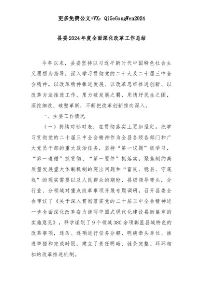 【七哥公文】2025年:县委2024年度全面深化改革工作总结+更多免费公文+VX:QiGeGongWen2024+更多免费公文+VX:QiGeGongWen2024