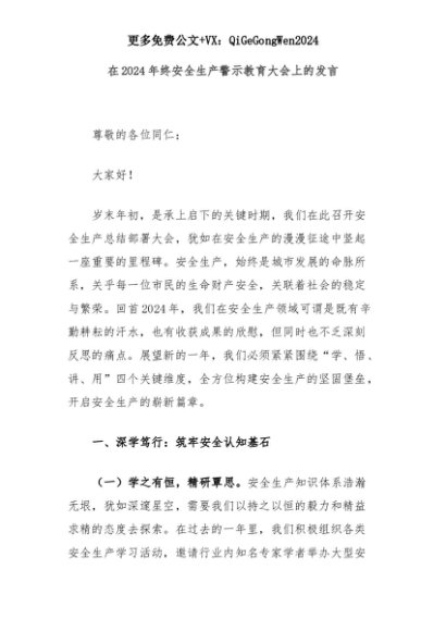 【七哥公文】2025年:在2024年终安全生产警示教育大会上的发言+更多免费公文+VX:QiGeGongWen2024+更多免费公文+VX:QiGeGongWen2024