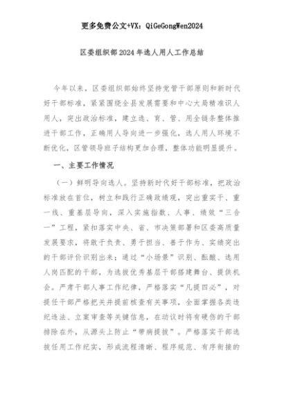 【七哥公文】2025年:区委组织部2024年选人用人工作总结+更多免费公文+VX:QiGeGongWen2024+更多免费公文+VX:QiGeGongWen2024