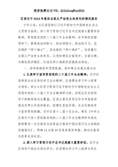 【七哥公文】2025年:区委关于2024年落实全面从严治党主体责任的情况报告+更多免费公文+VX:QiGeGongWen2024+更多免费公文+VX:QiGeGongWen2024