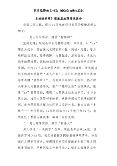 【七哥公文】2025年:县推进党建引领基层治理情况报告+更多免费公文+VX:QiGeGongWen2024+更多免费公文+VX:QiGeGongWen2024
