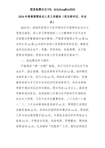 【七哥公文】2025年:2024年普通管理技术人员工作报告(党支部书记、作业长)+更多免费公文+VX:QiGeGongWen2024+更多免费公文+VX:QiGeGongWen2024
