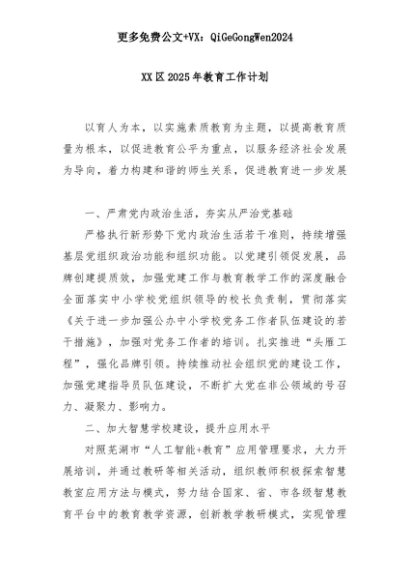 【七哥公文】2025年:XX区2025年教育工作计划+更多免费公文+VX:QiGeGongWen2024+更多免费公文+VX:QiGeGongWen2024
