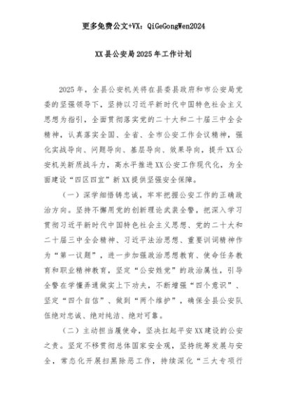 【七哥公文】2025年:XX县公安局2025年工作计划+更多免费公文+VX:QiGeGongWen2024+更多免费公文+VX:QiGeGongWen2024