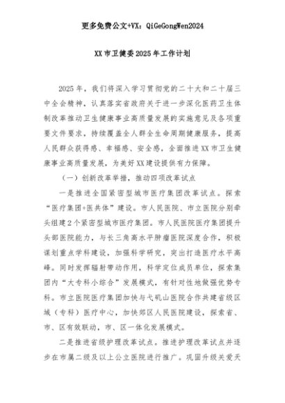 【七哥公文】2025年:XX市卫健委2025年工作计划+更多免费公文+VX:QiGeGongWen2024+更多免费公文+VX:QiGeGongWen2024